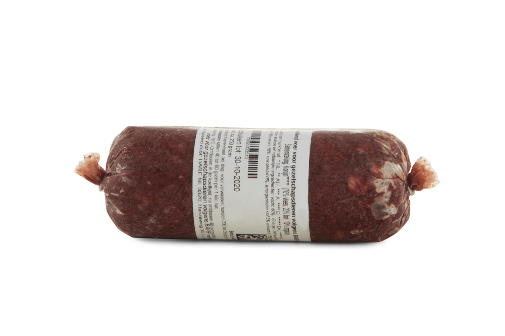 Alroda producten bevatten steeds één diersoort. De rolletjes zijn van 245 gram en geschikt voor hond en kat.
