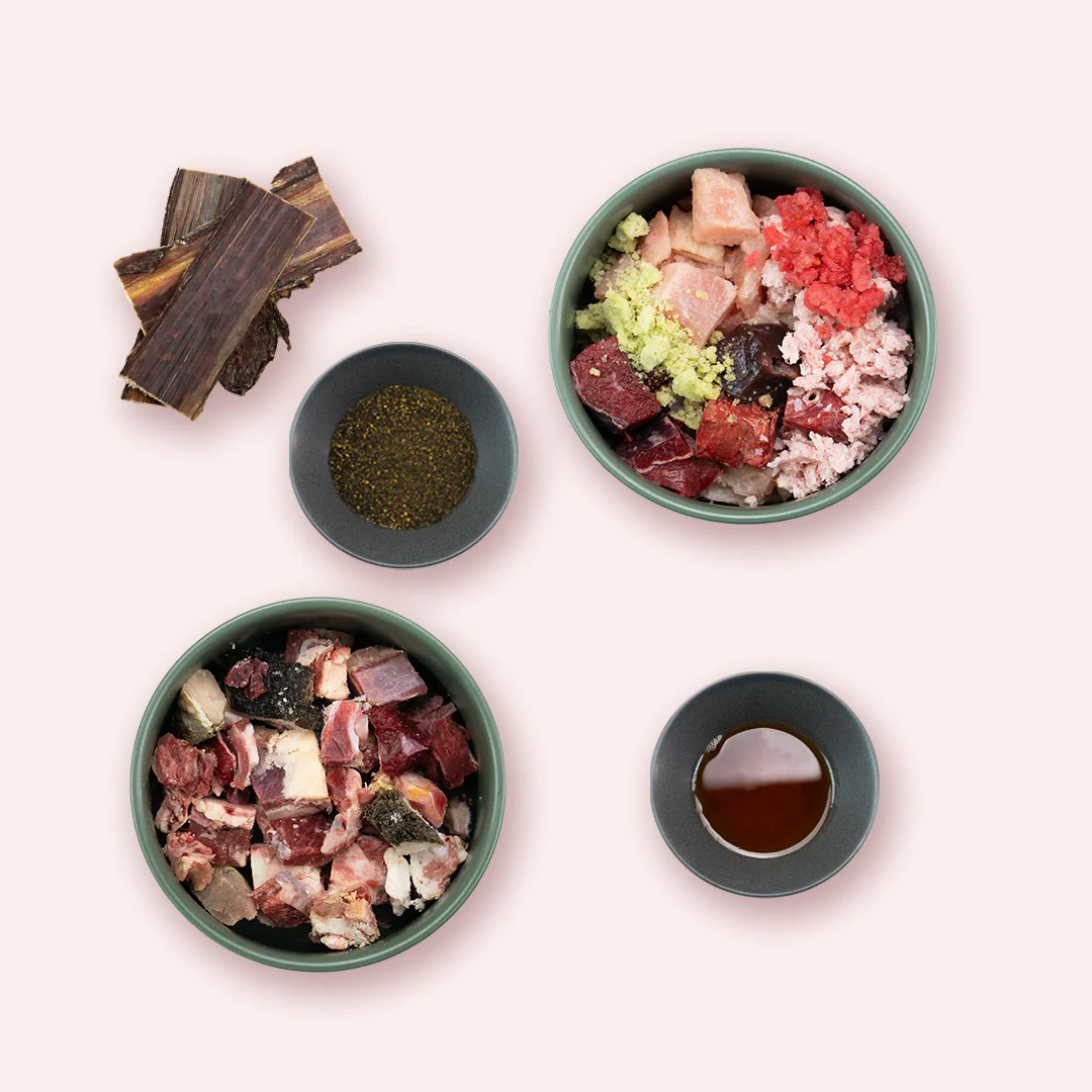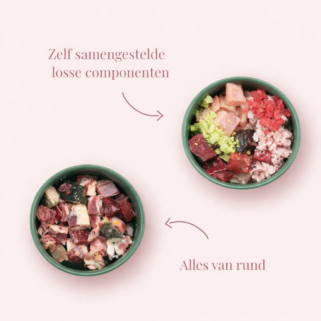 Dit starterpakket bevat een brede selectie rundonderdelen: van spiervlees en organen tot kraakbeen. Daarnaast zit er ook kip in als vetarme en licht verteerbare aanvulling. Hiermee dek je de belangrijkste voedingsbehoeften van jouw hond af.