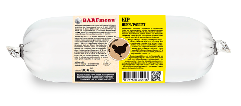 Kippenvlees, kippenbotten en kippenorganen. Verrijkt met dierlijke vezels, zalmolie, vitaminen en mineralen.
