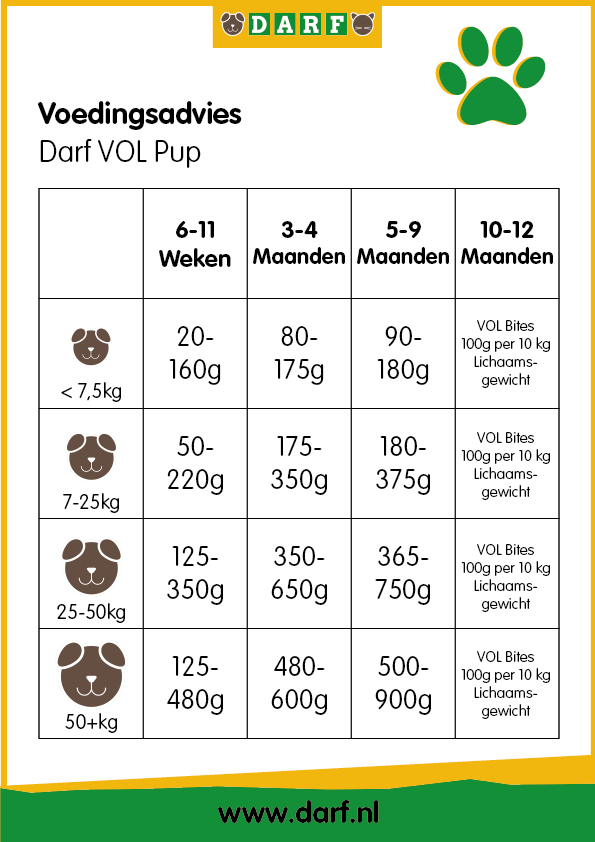 Het voedingsadvies voor pups ziet u in de afbeelding: